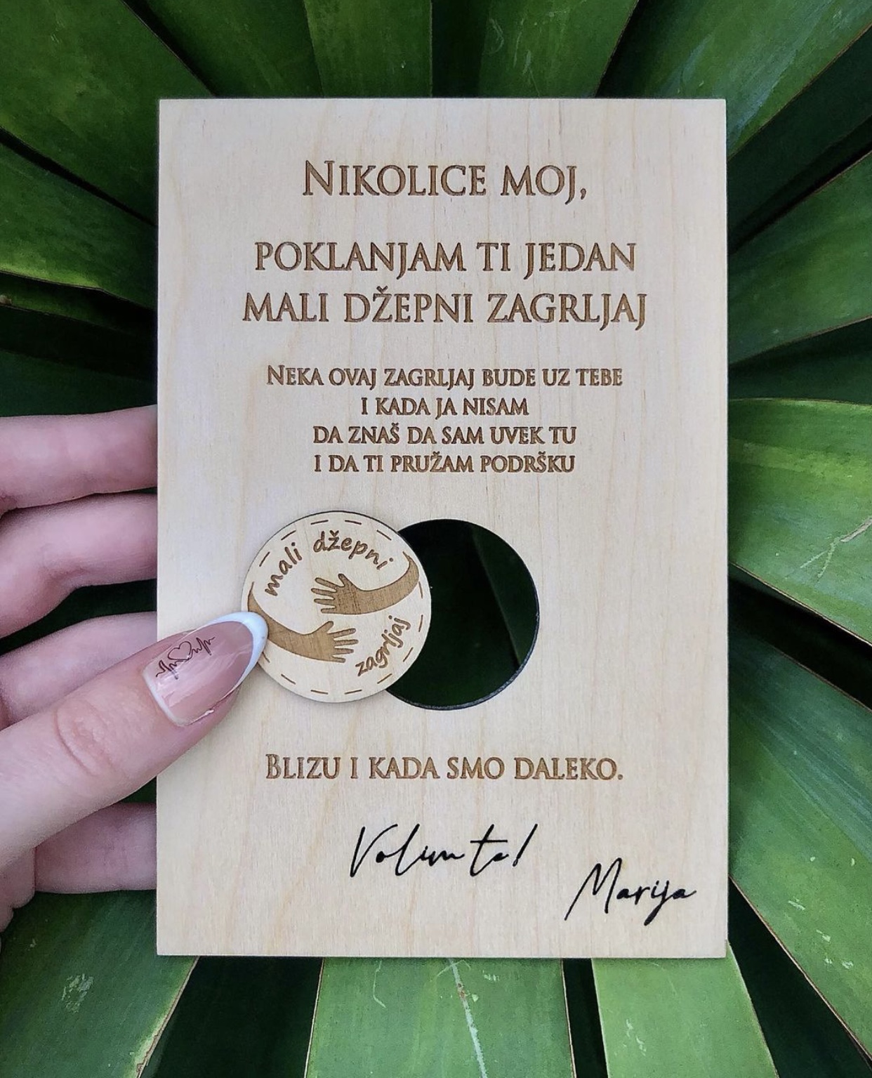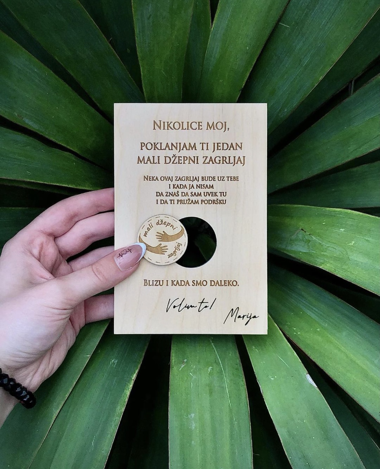 Dimenzija je 10x15cm i napravljen je od drveta kako bi preneo toplinu svakog zagrljaja i ulepšao dan vašim najmilijima 🍀